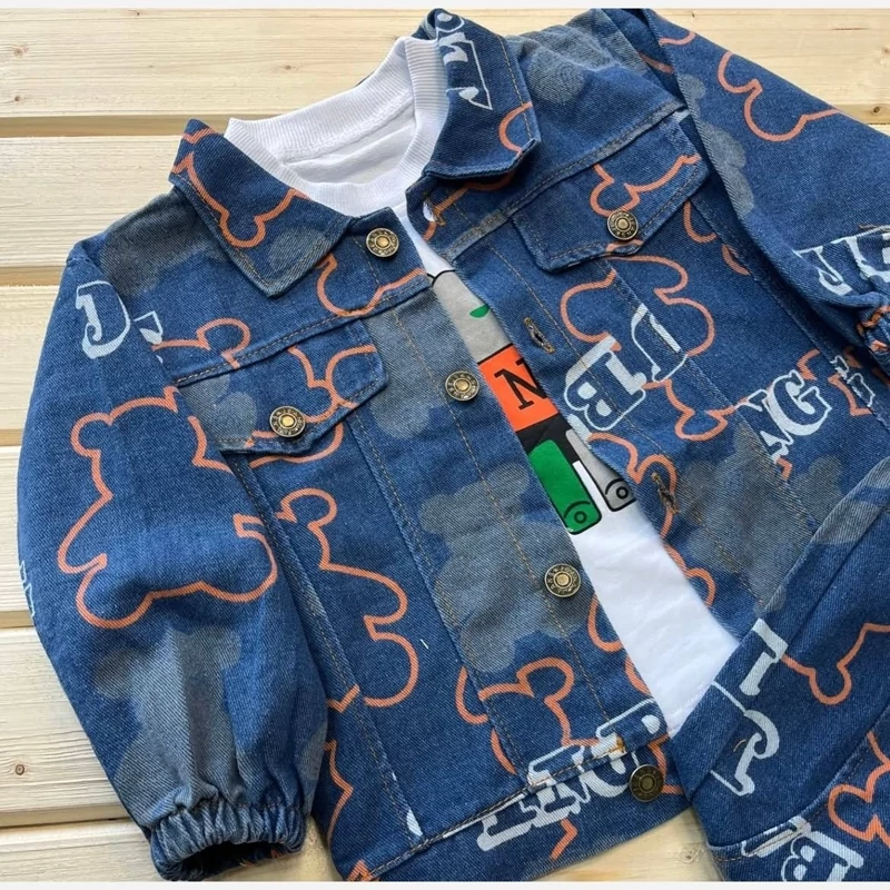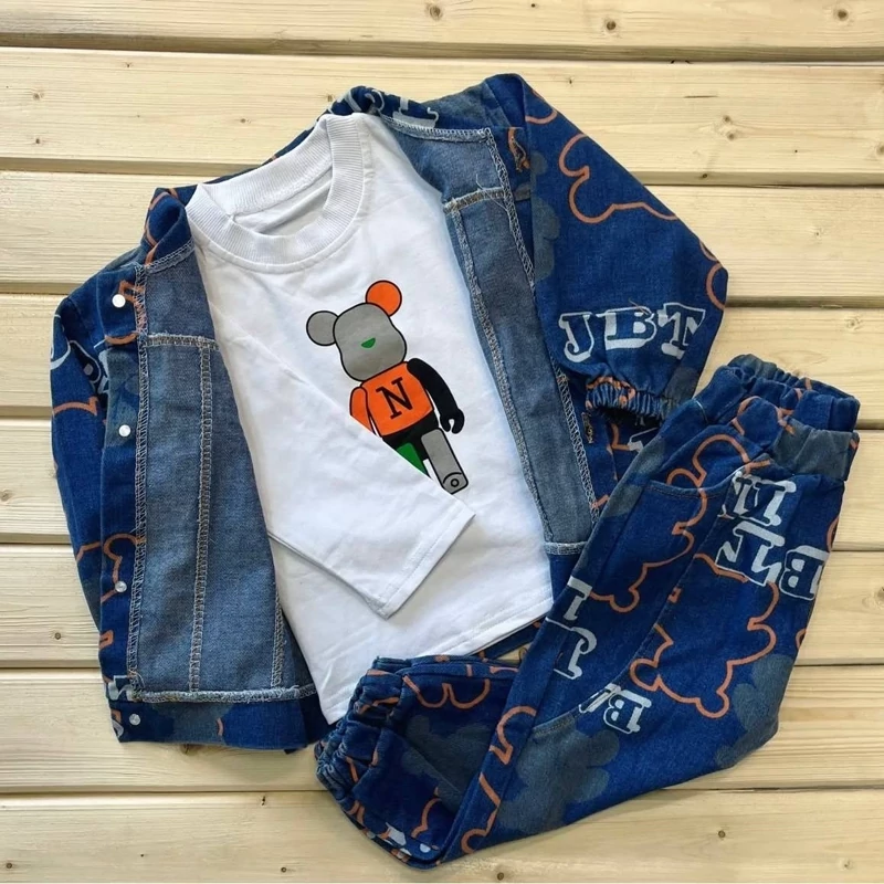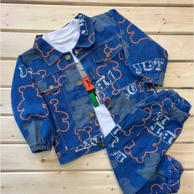 ست سه تیکه وارداتی جین شامل کت و شلوار جین و یک بلوز نخ پنبه آستین بلند .